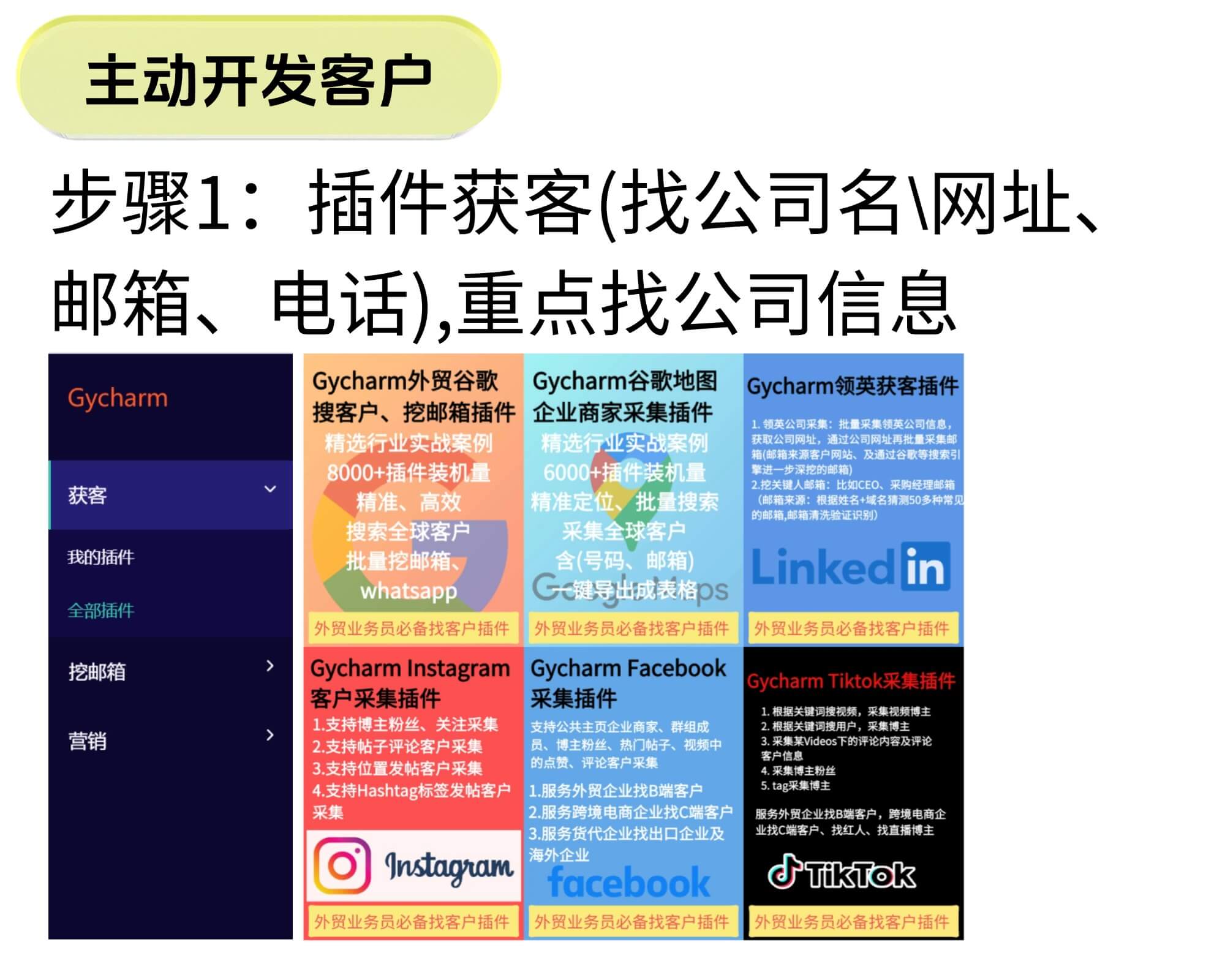 如Gycharm谷歌搜客戶、挖郵箱采集插件、Gycharm Google Maps谷歌地圖企業商家采集插件、Gycharm Linkedin領英外貿獲客插件、Gycharm Facebook采集插件、Gycharm Instagram采集插件、Gycharm Tiktok采集插件。以上獲客插件覆蓋了谷歌搜索引擎、谷歌地圖、領英、Facebook、Instagram、Tiktok主流獲客渠道,可以精準獲取全球客戶。
